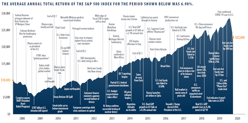 Last quarter, we described the multitude of events since the last black swan (2008 financial crisis): Greek bailout, U.S. debt downgrade, European sovereign debt crisis, “fiscal cliff”, Cyprus banking crisis, “taper tantrum”, Ebola virus, Syria, Chinese currency devaluation, Brexit, 2016 U.S. Presidential election, trade war, and many more. The below chart depicts these events, with the S&P 500 as a backdrop: