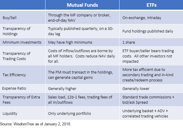 While ETFs and mutual funds are both a wrapper around a basket of securities, there are many key differences. ETFs provide much more transparency, flexibility, tradability and tax efficiency compared to their mutual fund counterparts. The investor knows exactly what he or she holds, and all of the costs and fees are transparent. Furthermore, an ETF investor will not be impacted by the actions of other holders of that ETF, whereas a mutual fund investor is at the mercy of other holders of that fund. So in a world of technology, would you prefer a black-and-white TV or a flat-screen color HDTV?