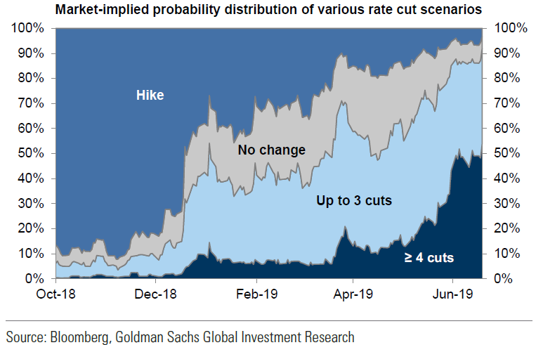 Investor sentiment continues hinging on every Fed-uttered word. The market expects a Fed rate cut later in July, with additional cuts coming over the next year. The swiftness with which market rate expectations have changed since October 2018 is staggering.