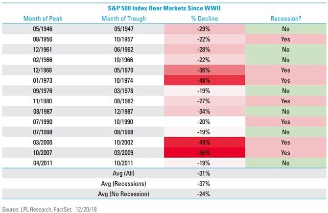 The challenging market environment was blamed on a host of factors including an overly aggressive Federal Reserve, trade tensions, political turmoil, and evidence of a global economic slowdown. In the U.S., debate now centers around whether a recession is on the horizon. Stocks are generally forward-looking indicators, and a 20% down move (arbitrarily defined as a bear market) has some wondering whether stocks might be trying to tell us something. Unfortunately, historical data proves inconclusive with only 7 out of the last 14 bear markets resulting in a recession.