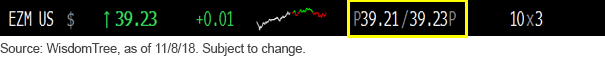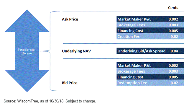 The main difference between ETFs and mutual funds is that ETFs are traded on an exchange and, as a result, the spread cost is fully transparent. Mutual fund holdings are not transparent, and nor are the costs baked into the NAV. With ETFs, investors know the exact cost to enter and exit their position, as illustrated by the spread seen on the exchange. Figure 1 deconstructs a basic ETF spread, using the WisdomTree U.S. MidCap Earnings Fund (EZM) from October 2018 as an example.