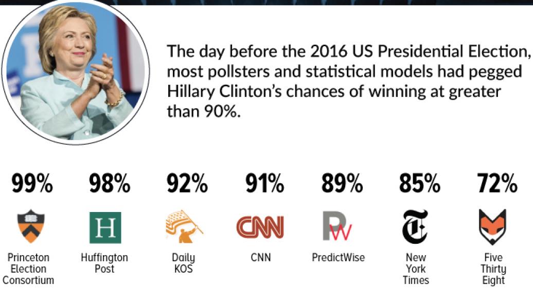From predictions of China’s economic demise to the Brexit (UK voting to leave the European Union) to the US presidential election, experts (and just about anyone else offering a prediction) had a rough year. According to The Economist, on the day of the Brexit vote, UK betting markets “priced about an 85% likelihood that Britain would remain in the EU”. On the day prior to the US election, Hillary Clinton winning the White House was nearly a foregone conclusion according to the polls.