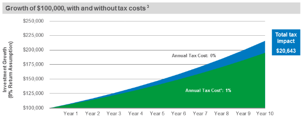 Just a 1% difference in tax cost (note that iShares found the average annual tax cost for a mutual fund was 1.3%), yielded more than a $20,000 difference in your account balance over 10 years! $20,000! And this doesn’t account for any reduction in investment costs by using ETFs or the avoidance of mutual fund manager underperformance.