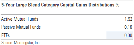 In addition to ETFs providing you with more control over when you realize taxes, it’s important to point out that another, more significant component of ETF tax efficiency is that most ETFs are passively managed. In other words, they simply track an index instead of paying a high priced manager to attempt to pick individual stocks for the fund (which, historically, they haven’t been very good at – but that’s a discussion for another time). This means lower turnover (less buying and selling) of the underlying stocks in the fund. And that means fewer taxable events. The below chart from Morningstar’s “ETFs Under the Microscope: Tax Efficiency Survey” shows how capital gain distributions for actively managed mutual funds, passively managed mutual funds, and ETFs compare in the large blend category: