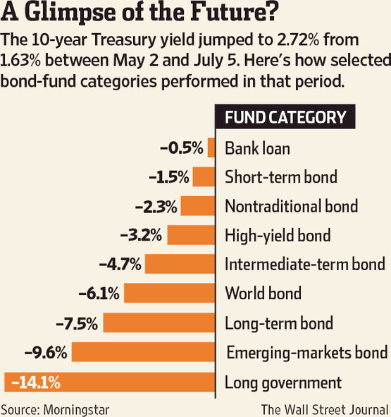 In our weekly market update, we talked rising interest rates and how they can impact your bond portfolio. As interest rates rise, bond prices decline – and depending on the types of bonds in your portfolio, these declines can be significant. The Wall Street Journal recently published an excellent chart outlining the impact of the most recent spike in interest rates and the return figures may surprise you: