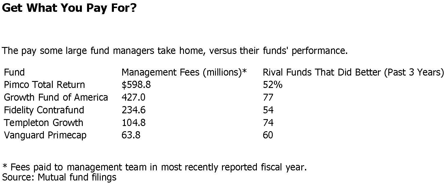 But wait, it gets worse. Not only do investors get this severe underperformance with actively managed mutual funds, but they also get to overpay for this gross underperformance. A recent article from smartmoney.com provided an excellent graphic depicting this. The below chart from the article shows the money that five of the largest mutual funds out there is raking in from investors and more importantly, how these funds are performing (or not) relative to their competition: