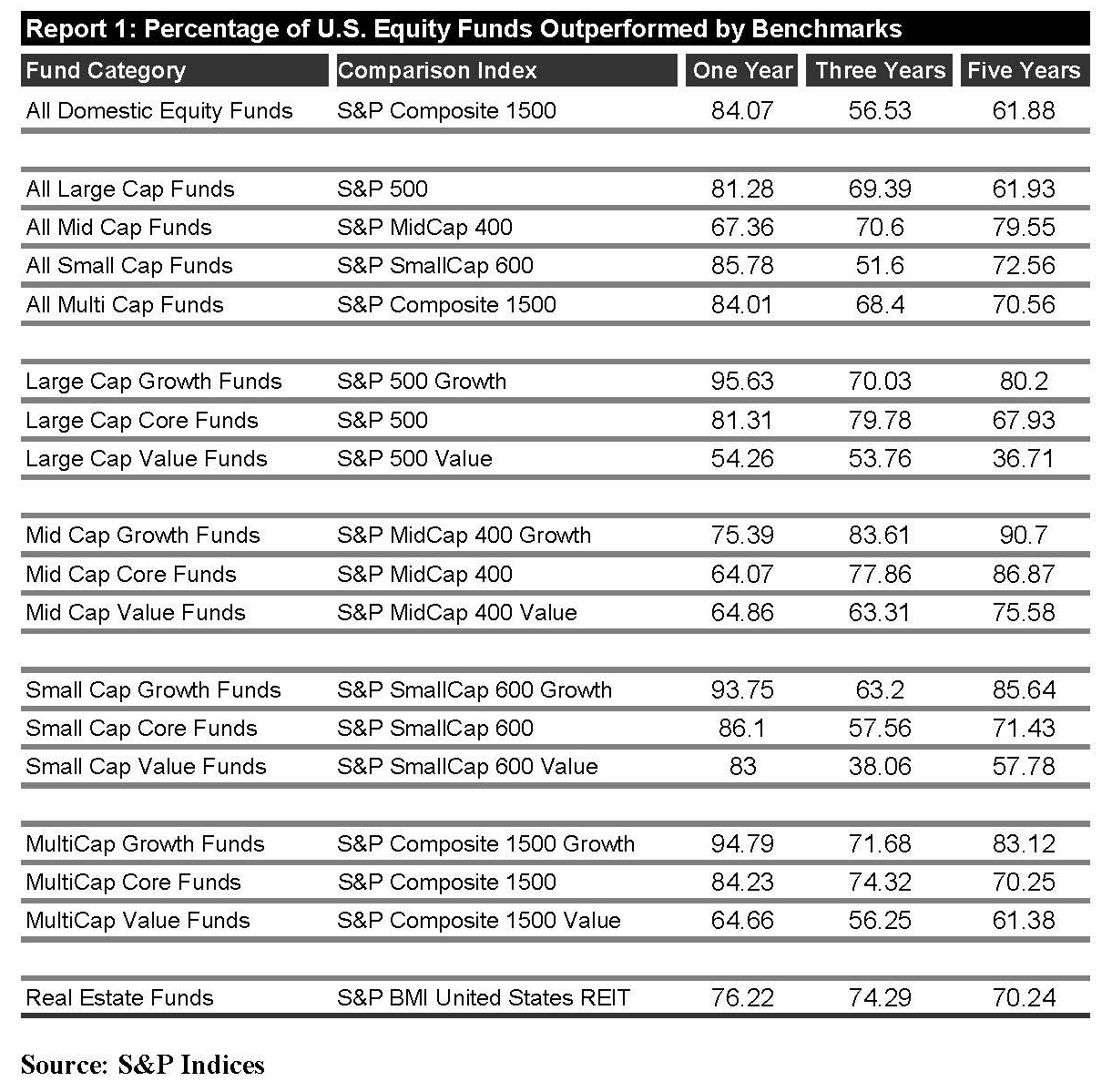 If you’ve been following our commentary, whether through our blog or on our radio show, you know that a favorite subject of ours is the underperformance of actively managed mutual funds. In case you missed it, approximately 84% of actively managed US equity mutual funds underperformed their relative S&P benchmark in 2011. That’s right – 84%! Over the past three and five years, 56% and 61%, respectively, of actively managed US equity mutual funds have underperformed their benchmark. Here’s a full chart of the carnage from SPIVA:
