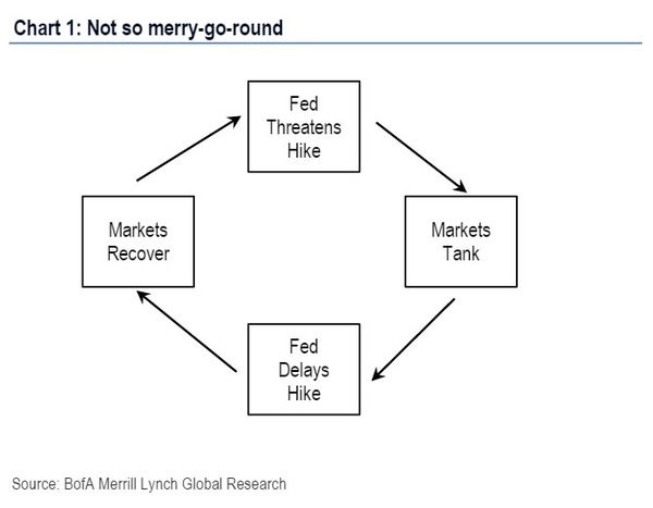 After the 2007-2008 financial crisis, central banks around the world embarked on unprecedented stimulus in an effort to spark the global economy. This stimulus has resulted in varying degrees of success, but one thing is certain: as it relates to the financial markets, central bank stimulus has led us into uncharted waters, creating market distortions and leaving market participants unsure how to respond to both ordinary and extraordinary events. Whether it be the mix of issues we saw in the first quarter, the Brexit in the second quarter, or the always looming threat of Fed rate hikes, the markets initially react negatively to the news and then seem to quickly brush aside any concerns. To further illustrate this point, as it relates to Fed rate hikes, the following chart offers a crude, though accurate, depiction of the Fed “merry-go-round”: