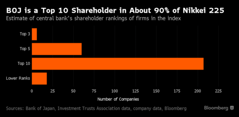 The first chart shows the increasing proportion of negative-yielding bonds across the globe, which is largely a result of central bank bond buying. What are negative yielding bonds? You willfully lend your money to, say, the Japanese Government, knowing in advance you will get less back than initially lent! Believe it or not, there are now roughly $10 trillion of these bonds around the world! And speaking of Japan, their central bank happens to be a top 10 shareholder in some 90% of their “blue-chip” stocks (second chart). The Bank of Japan is creating money out of thin air and using that money to purchase Japanese stocks. We could go on with similarly unbelievable charts, but you get the idea. There is nothing normal about $10 trillion in negative yielding bonds or a major central bank owning a huge chunk of a country’s major stocks.