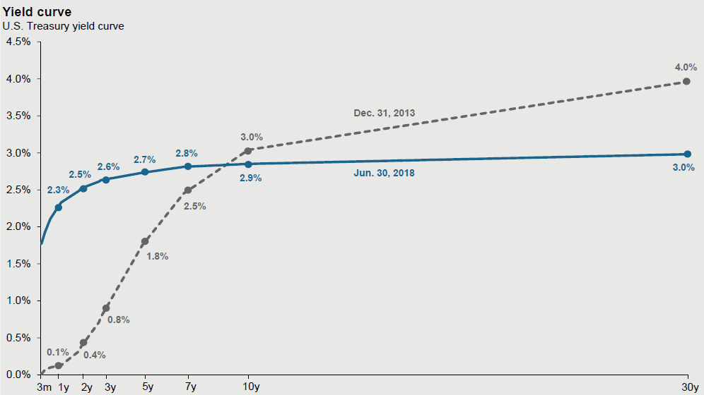 The swinging economic pendulum might best be reflected in the yield curve, where short-term interest rates have risen, while longer-term interest rates remain flat. Note the contrast between interest rates at the end of 2013 and the current yield curve structure: