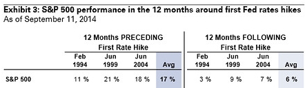 Federal Reserve Policy Actions. As it relates to uncertainty over Fed policy tightening, interestingly, while investors fret that a rise in interest rates will result in steep stock declines, history tells us a different story. While stock returns certainly are not as high following a rate increase as they are leading up to a rate increase, there is hardly cause for concern. The following abbreviated chart courtesy of Goldman Sachs Global Investment Research and The Wall Street Journal shows that for the three most recent Fed rate increases, the S&P 500 has averaged a 17% gain in the 12 months leading up to the increase and a 6% average gain in the 12 months after an increase. While stock market returns are clearly lower than prior to Fed rate hikes, again, there is nothing overly frightening about positive returns: