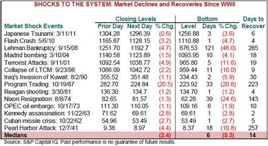 Geopolitical Events. With the situations in Syria/Iraq and Ukraine, it is helpful to consider how stocks have reacted historically to past military confrontations, political events or other similar scenarios. The below analysis from S&P Capital IQ offers a nice snapshot of stock market reactions to various unanticipated shocks (“including wars and near wars, assassinations and attempts, terrorist attacks, and financial collapses”). The data paints a compelling picture. After the initial event, which resulted in a median stock market decline of 2.5%, stocks found a bottom in only six days and all losses were recouped in just 14 days. For investors concerned that current geopolitical events may lead to severe market declines, history shows there is not much to be afraid of here: